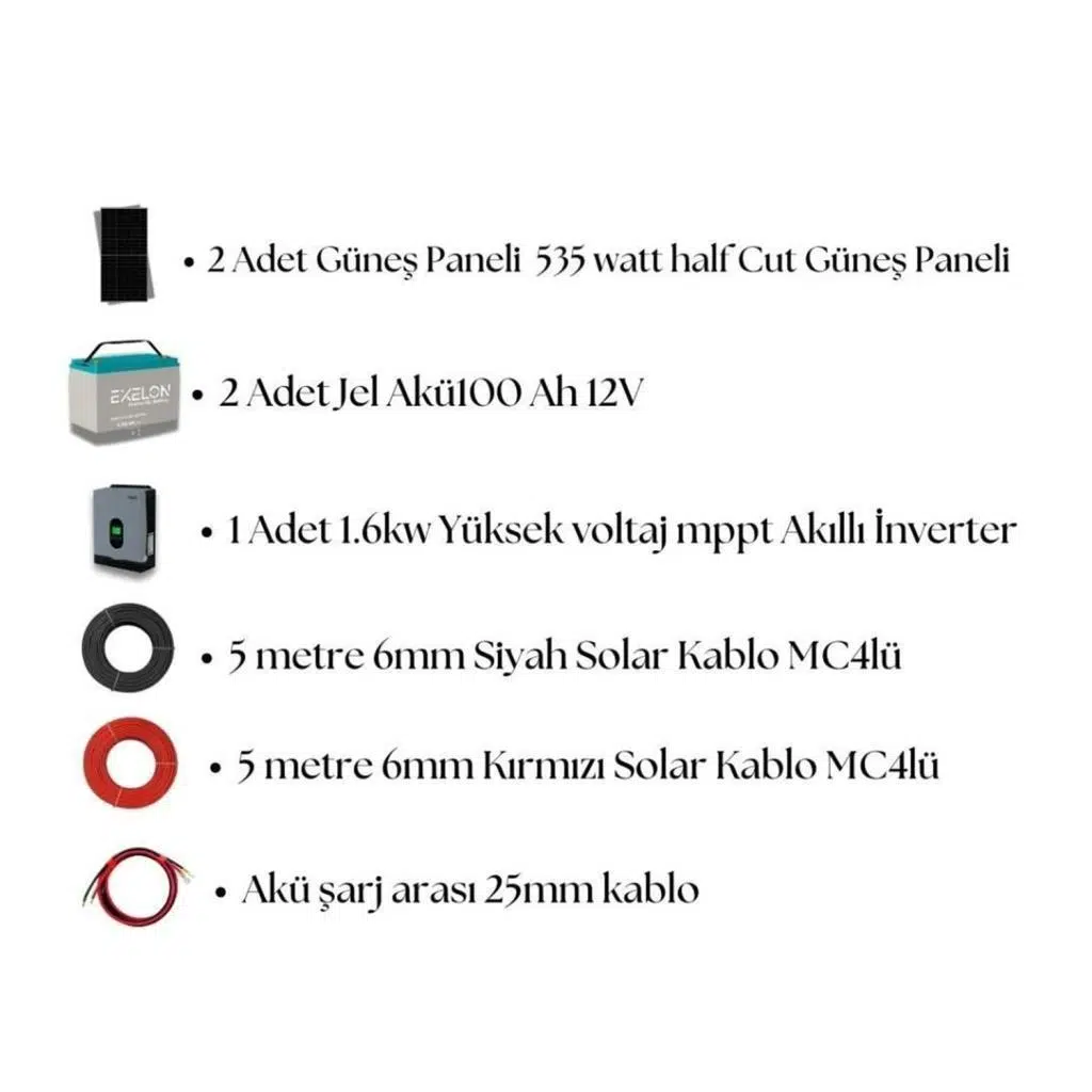 Elektrik kesintilerine karşı güvenilir, doğa dostu ve ekonomik bir enerji çözümü sunan 1600W Solar Paket, günlük temel elektrik ihtiyacınızı karşılayacak şekilde tasarlanmıştır. Yüksek voltajlı MPPT inverter, jel aküler ve Half-Cut güneş panelleri ile uzun ömürlü ve verimli bir kullanım sağlar.