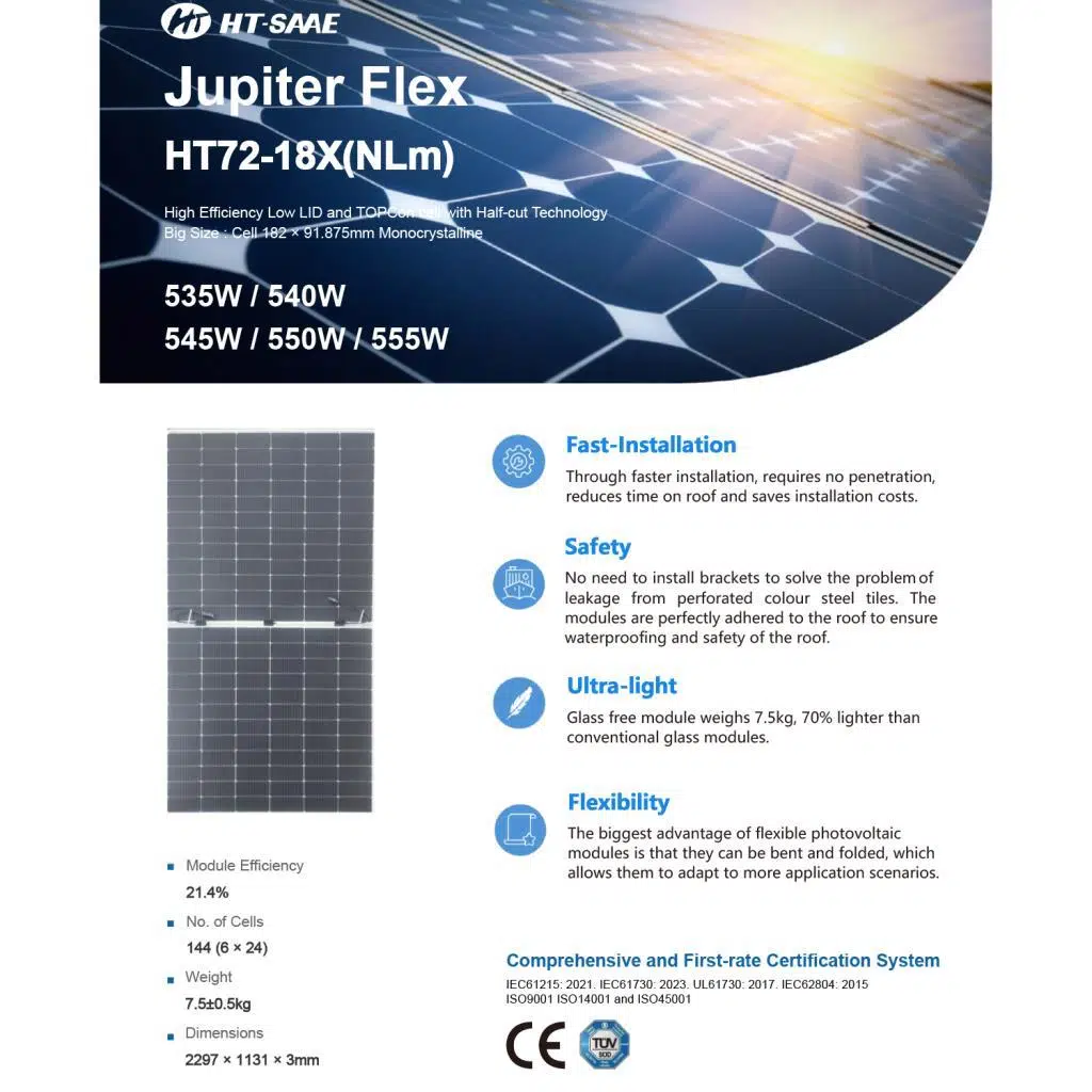 550W Esnek Panel HT Solar, yüksek enerji üretim kapasitesi ve esnek yapısı ile öne çıkan yenilikçi bir güneş panelidir. 21,2% verimlilik oranı sayesinde güneş ışığını en verimli şekilde elektriğe dönüştürür. Hafif, dayanıklı ve esnek yapısı ile kamp, karavan, tekne, RV ve açık hava etkinlikleri için mükemmel bir enerji çözümüdür.