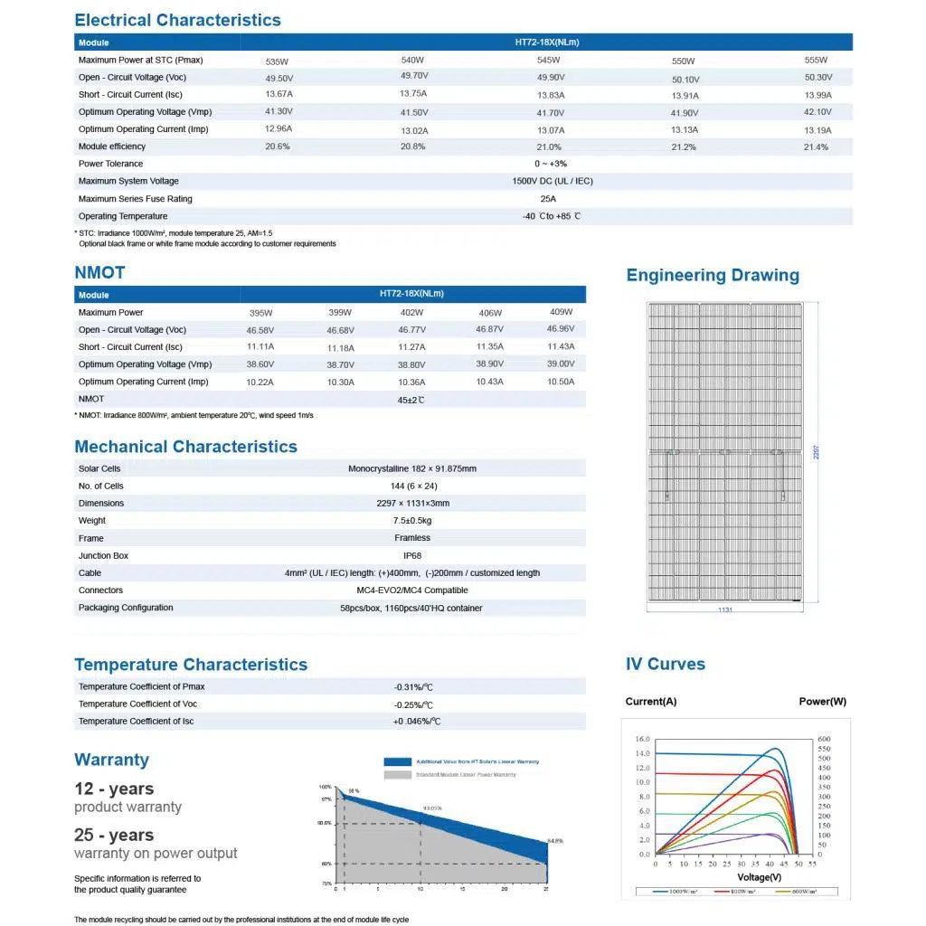 • Yüksek Güç ve Verimlilik: 550W çıkış gücü ve %21,2 modül verimliliği ile güçlü enerji üretimi sağlar.