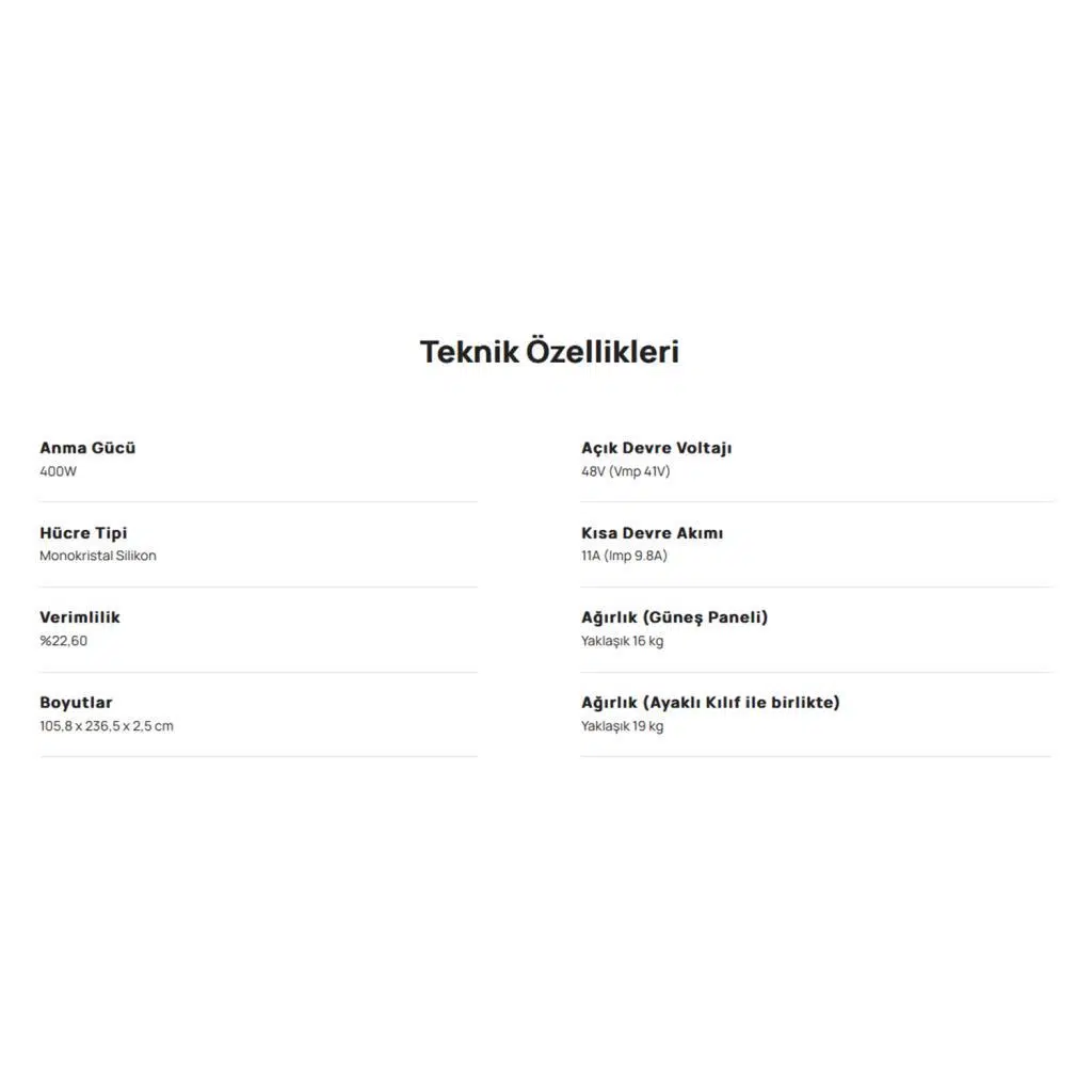 • Ağırlık: 16 kg (panel), 19 kg (toplam)