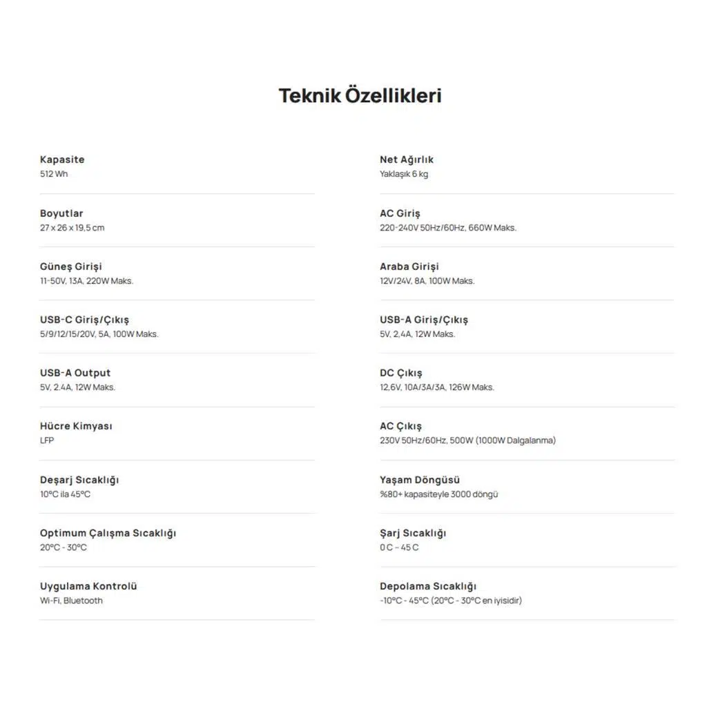 • AC Çıkış Gücü: 500 W sürekli, X-Boost ile 1000 W’a kadar güç