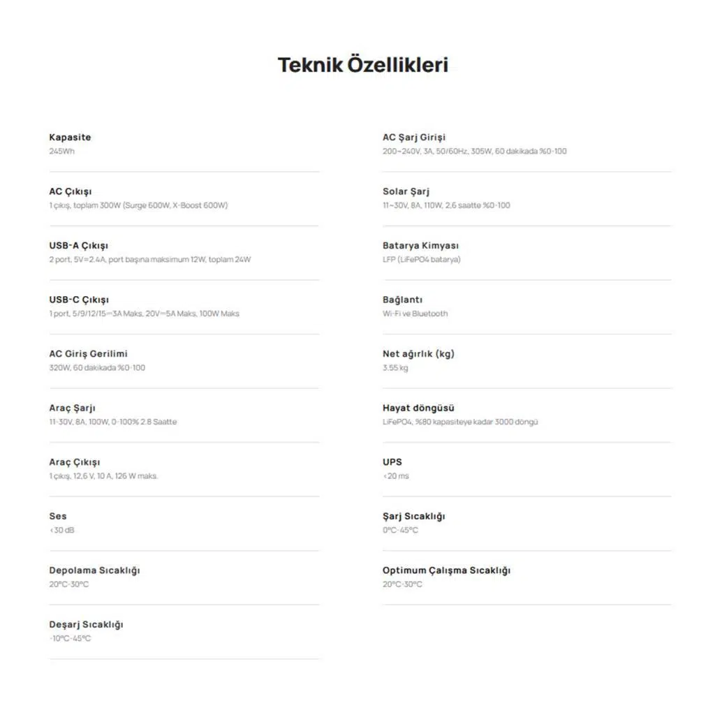 • AC Çıkışı: 300 W sürekli, 600 W X-Boost