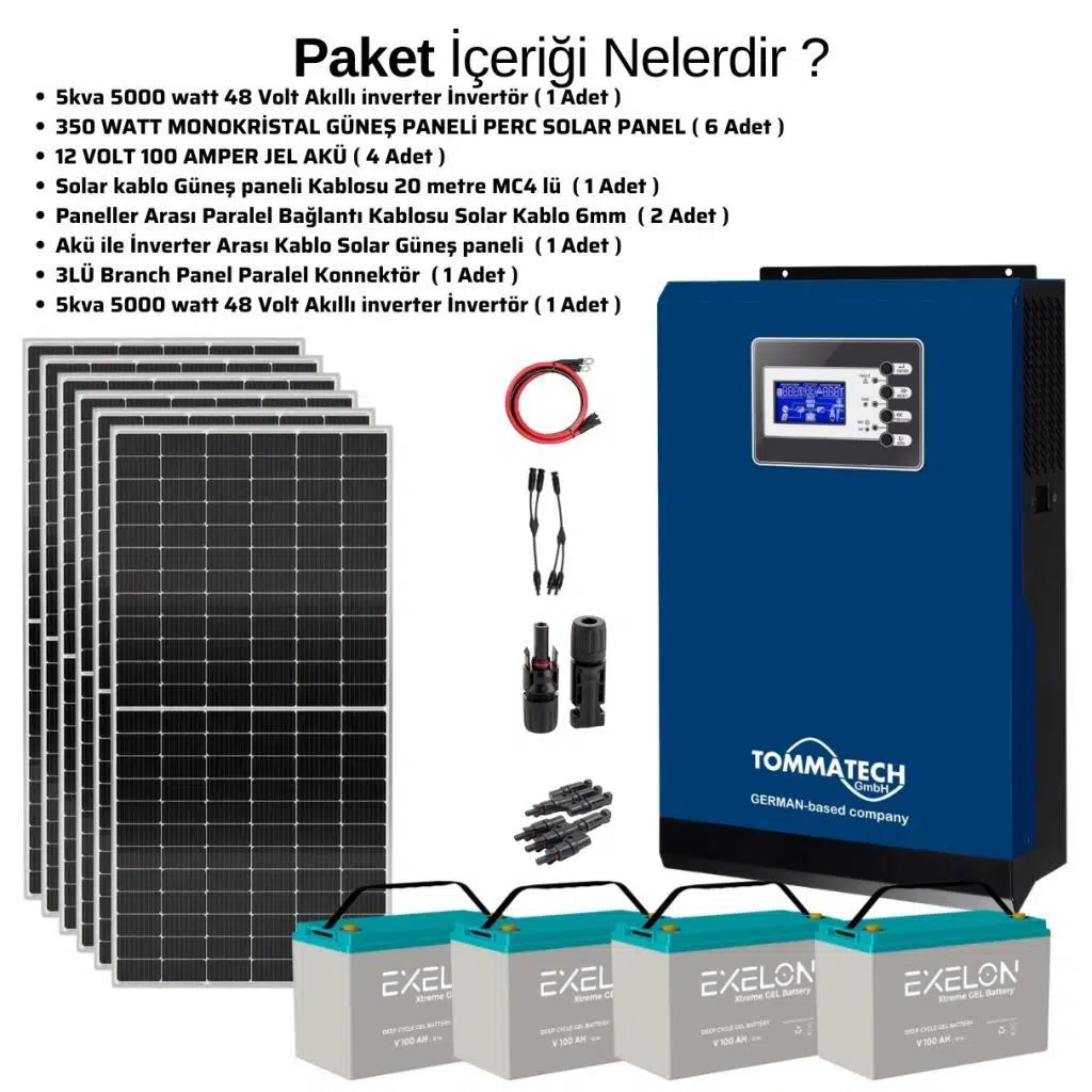 Güneş Enerjisi Bağ Evi Solar Paketi 5KVA İnverter 350W Güneş Paneli 100Ah Jel Akü