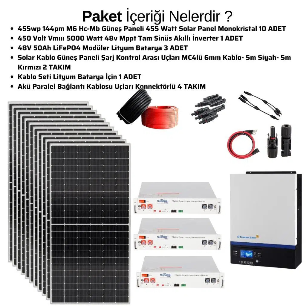 Güneş Enerjisi Solar Paketi 5kva İnverter 550 watt Güneş Paneli 48V 50 Amper Lityum Akü