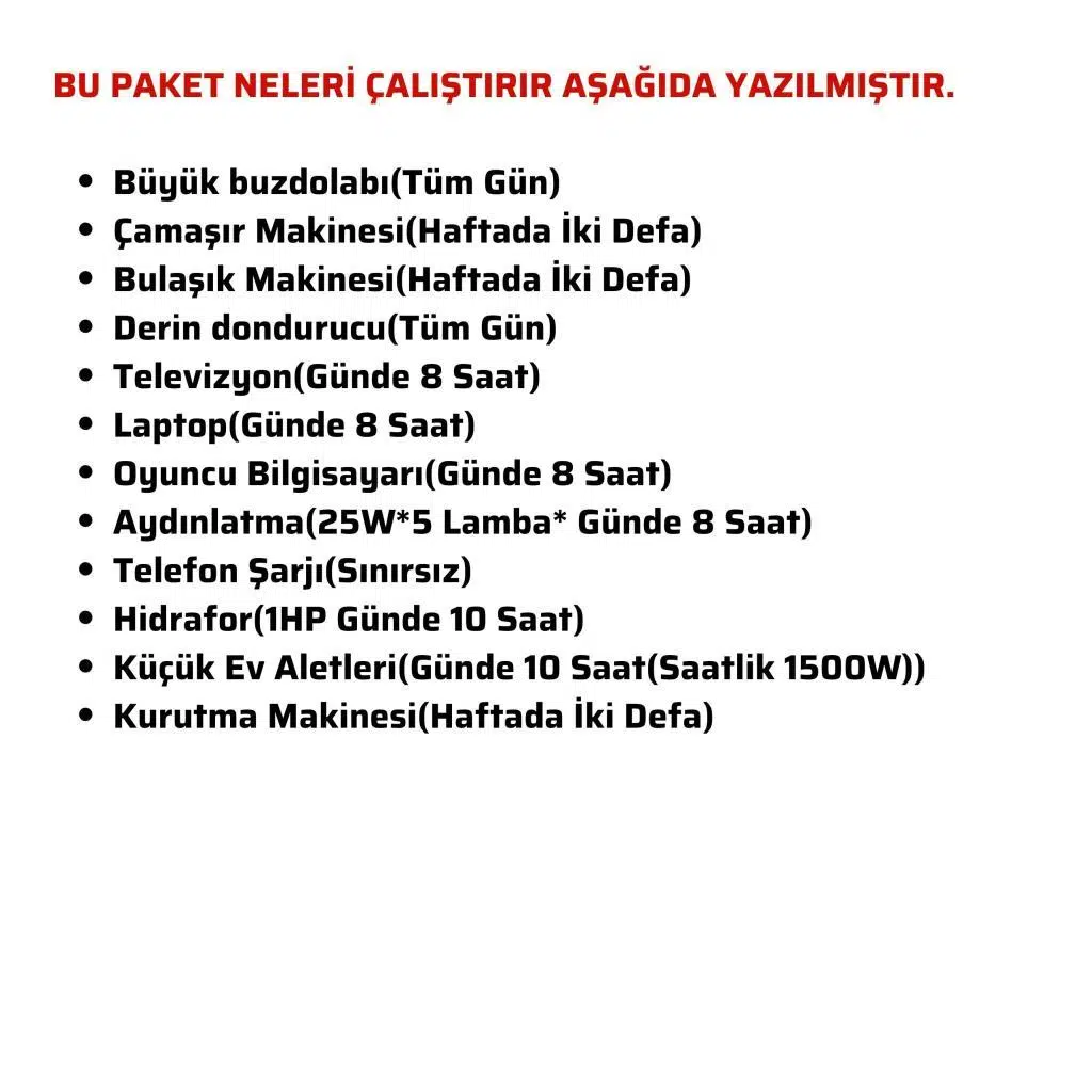 Bu güçlü güneş enerjisi paketi, aşağıdaki cihazları kesintisiz çalıştırır: