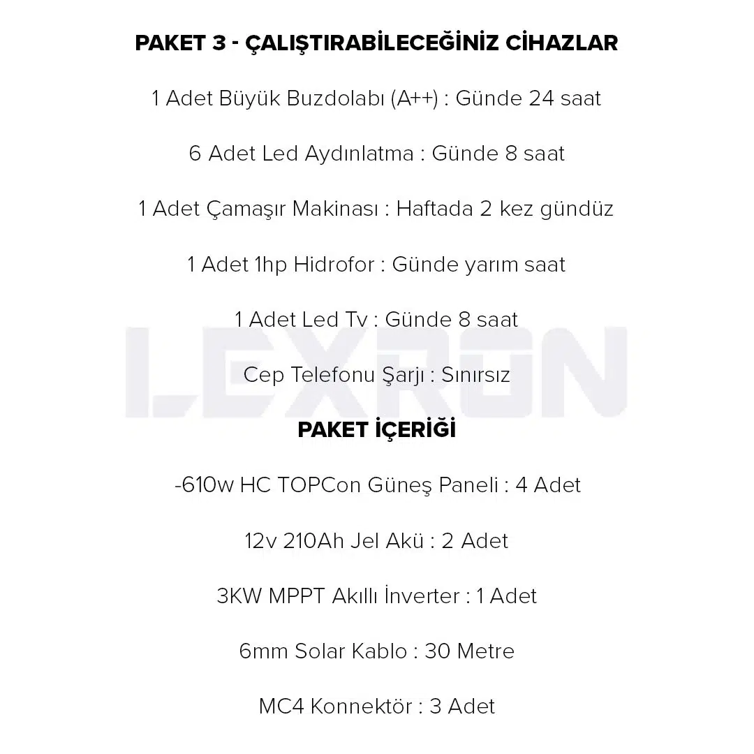 | Etiketler | LEXRON 3kW BAĞ EVİ PAKET SİSTEM 2 |