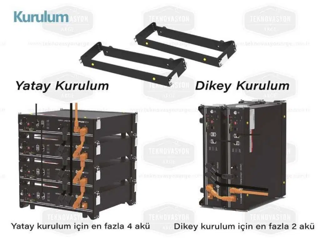 Braketlerle birbirlerine sabitlenen akü modülleri; yatay durumda yerleştirilirse 4 adet, dikey yerleştirilecekse 2 adet olabilir.