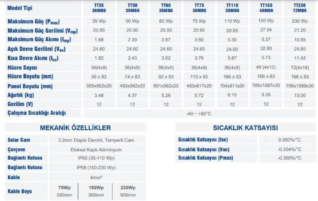 | Etiketler | TommaTech 150 w Watt 48PM M6 Half Cut Multibusbar Güneş Paneli Solar Panel Monokristal Ürün Kodu : TT150-48MB |