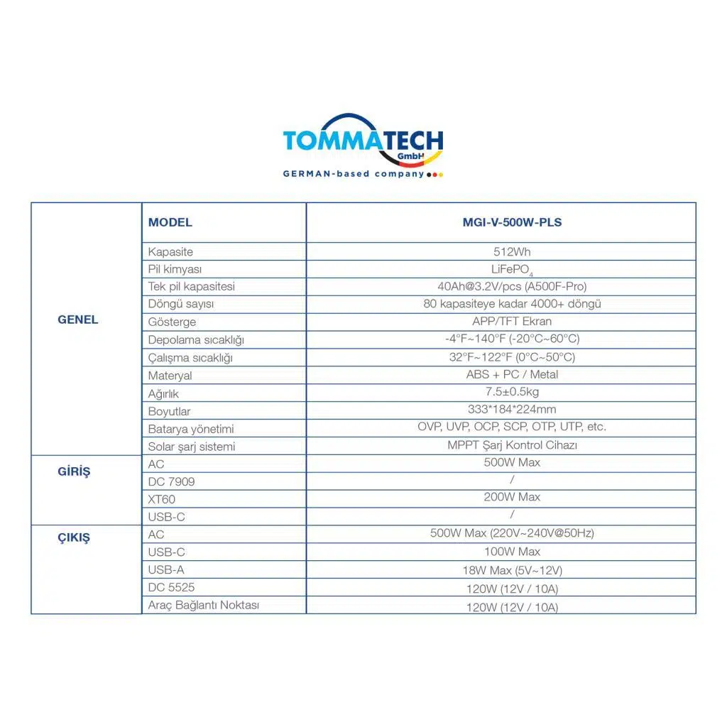 TommaTech MGI-V-512W, yüksek kapasiteli LiFePO₄ batarya teknolojisi ve 4000+ döngü ömrü ile kamp, karavan, acil durum ve mobil enerji ihtiyaçlarınız için ideal bir çözümdür. 7.5 kg hafif tasarımı, APP/TFT ekranı, çoklu AC/DC çıkışları ve MPPT solar şarj desteği ile enerji özgürlüğünüzü artırır.