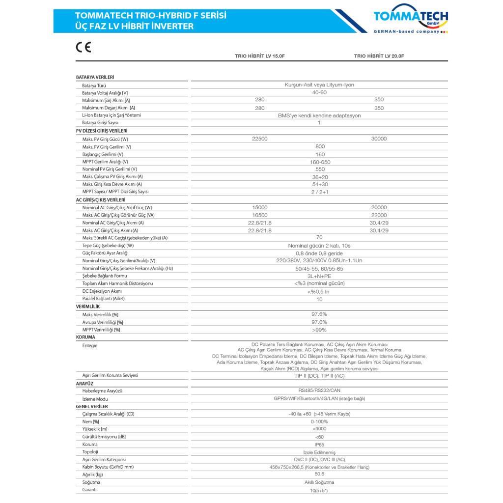 TommaTech F Serisi 15.0 kW Üç Faz LV Hibrit İnverter