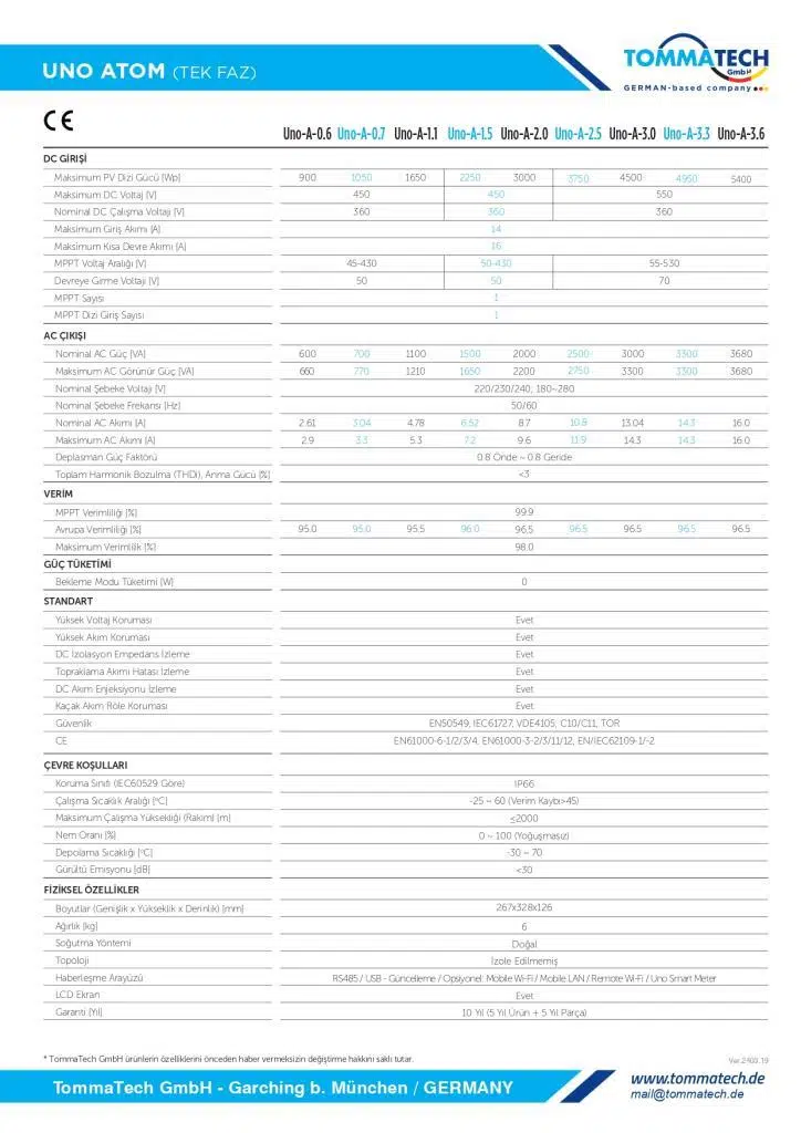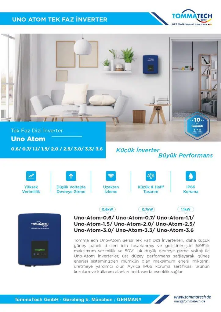 TommaTech Uno-Atom Serisi Tek Faz Dizi İnverterleri, daha küçük güneş paneli dizileri için tasarlanmış ve geliştirilmiştir. %98’lik maksimum verimlilik ve 55V’ luk düşük devreye girme voltajı ile Uno-Atom İnverterler, üst düzey performans sağlayarak güneş enerjisi sisteminizden mümkün olan maksimum enerji miktarını üretmeye yardımcı olur. Ayrıca IP65 koruma sertifikası ürünün kurulum ve kullanım alanları noktasında esneklik sağlar.Yüksek verimlilik