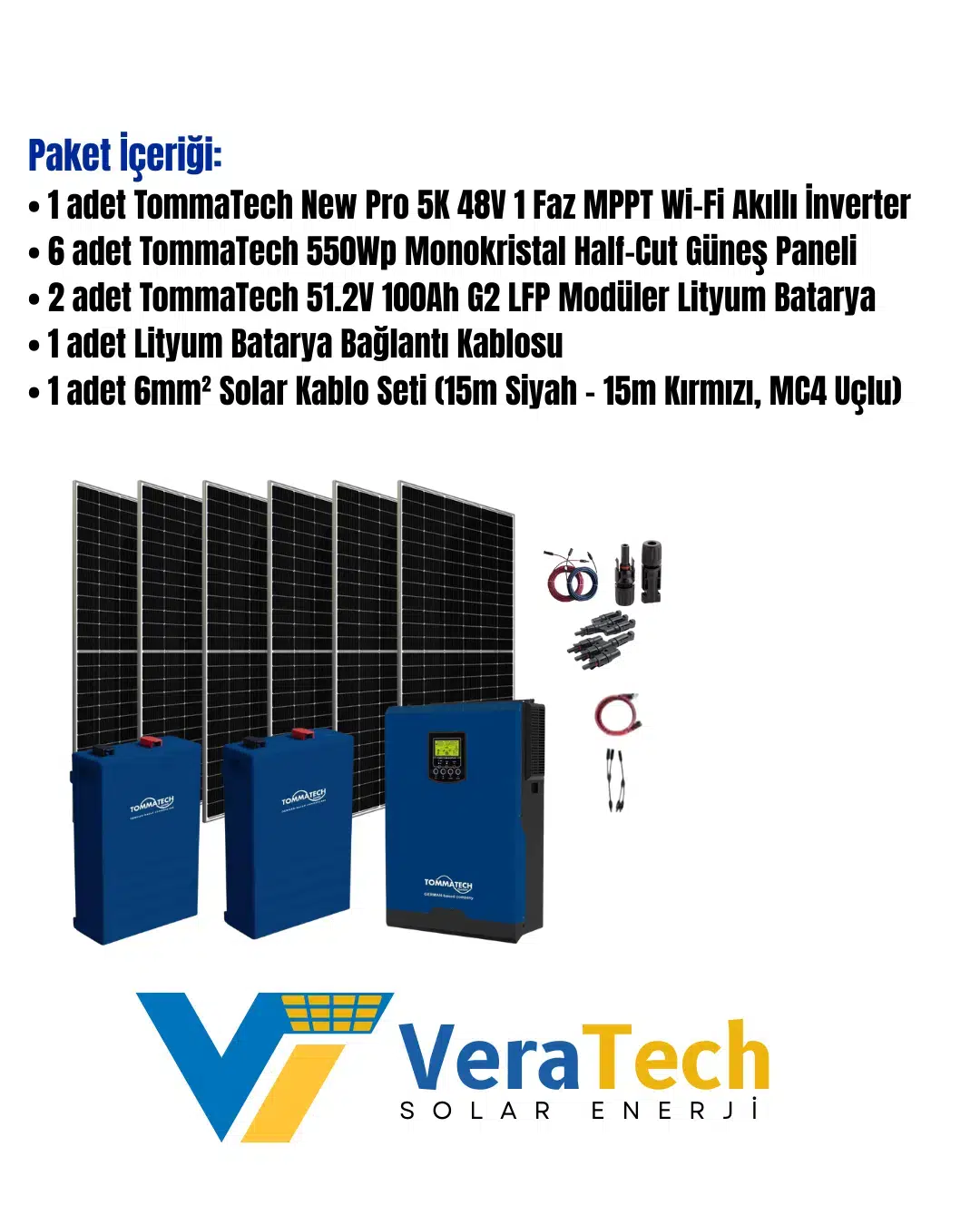 VeraTech Büyük Bağ Evi Solar Paketi 600w Güneş Paneli 5kw İnverter 10Kw Lityum Akü