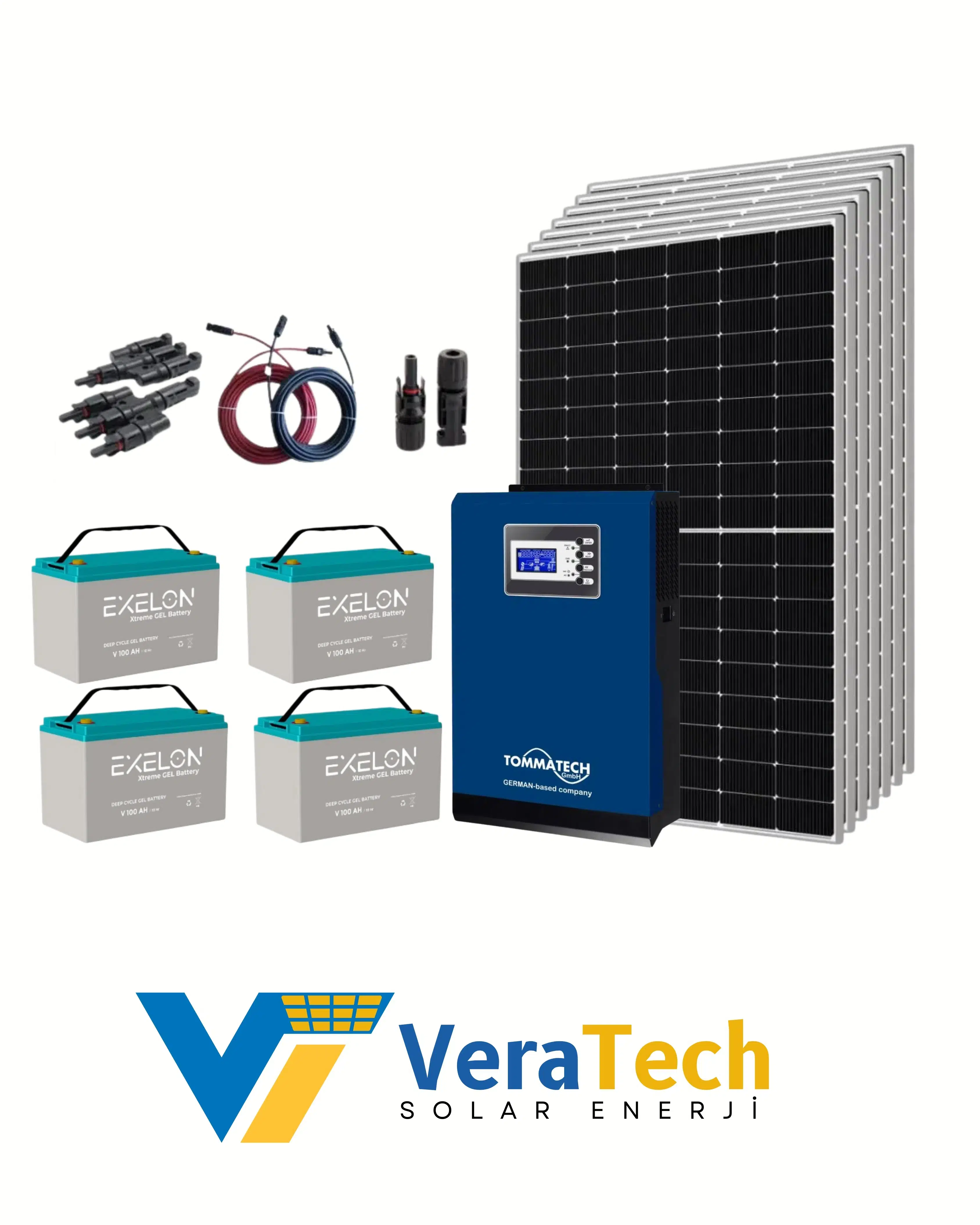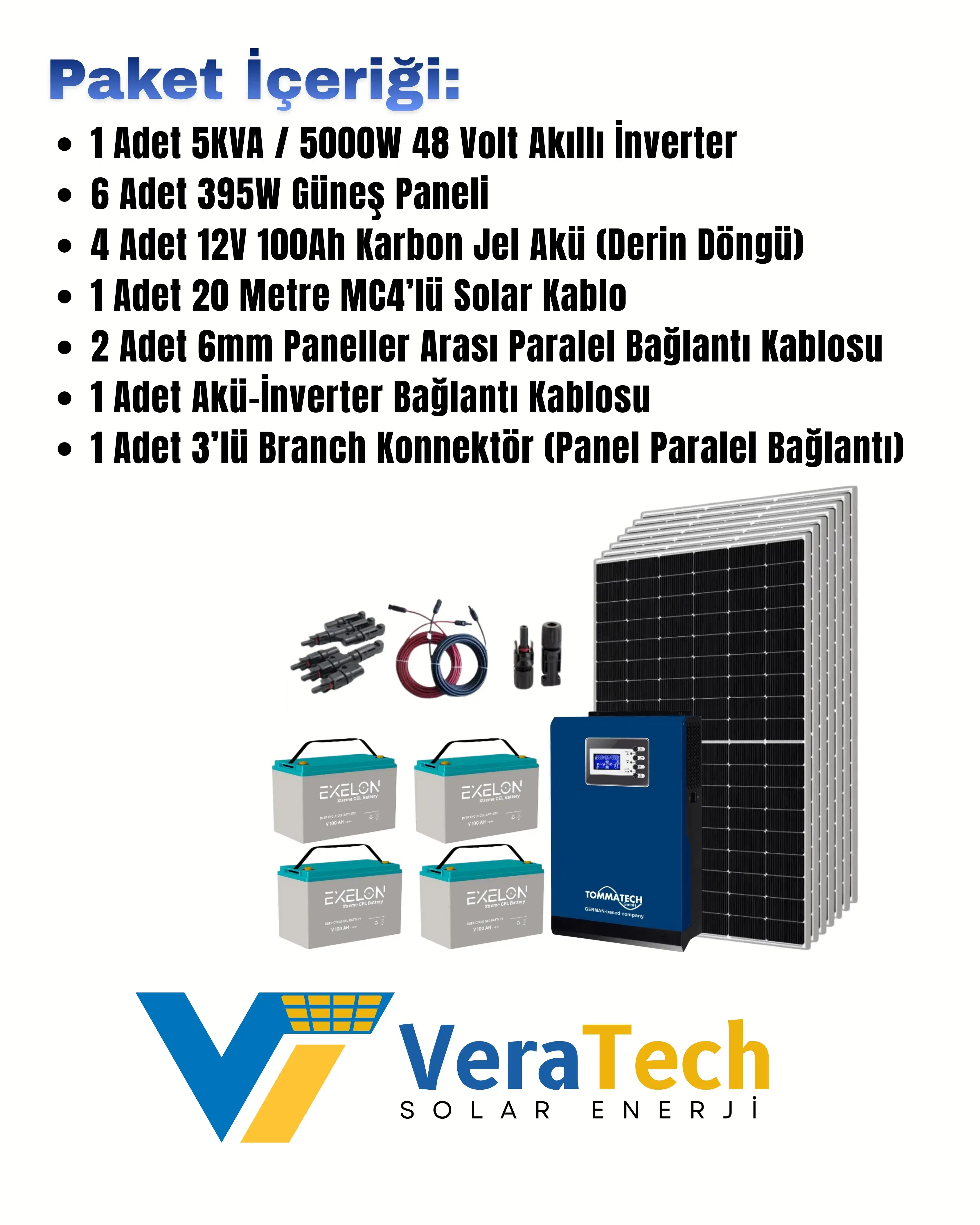 VeraTech Güneş Enerjisi Bağ Evi Solar Paketi 5KVA İnverter 400W Güneş Paneli 100Ah Jel Akü